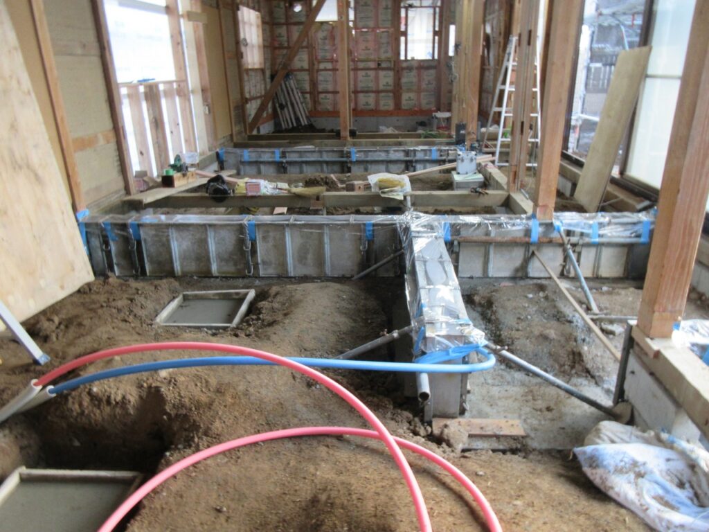 間仕切りや床、壁、天井を解体します間仕切りの位置を変えるので、耐力壁の位置に新たに基礎を作ります
