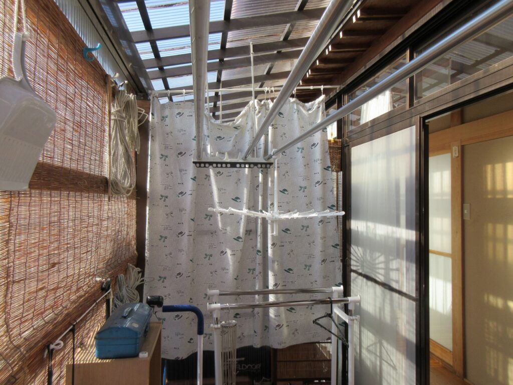 右、着工前の物干し:アルミ製の物干しですが、冬は結露がひどいので撤去して同程度の広さの物干し場を作ります。
