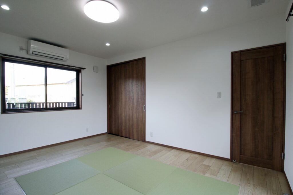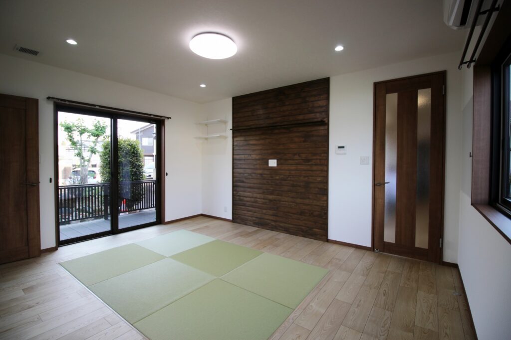 居間はフローリング床の中央に畳を敷きました