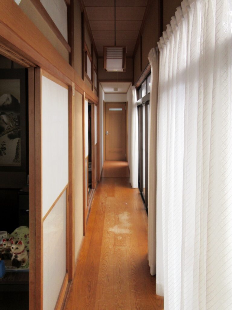 左、着工前の縁側:長い縁側に付随する部屋のレイアウトで、奥のトイレまで少し距離があります。